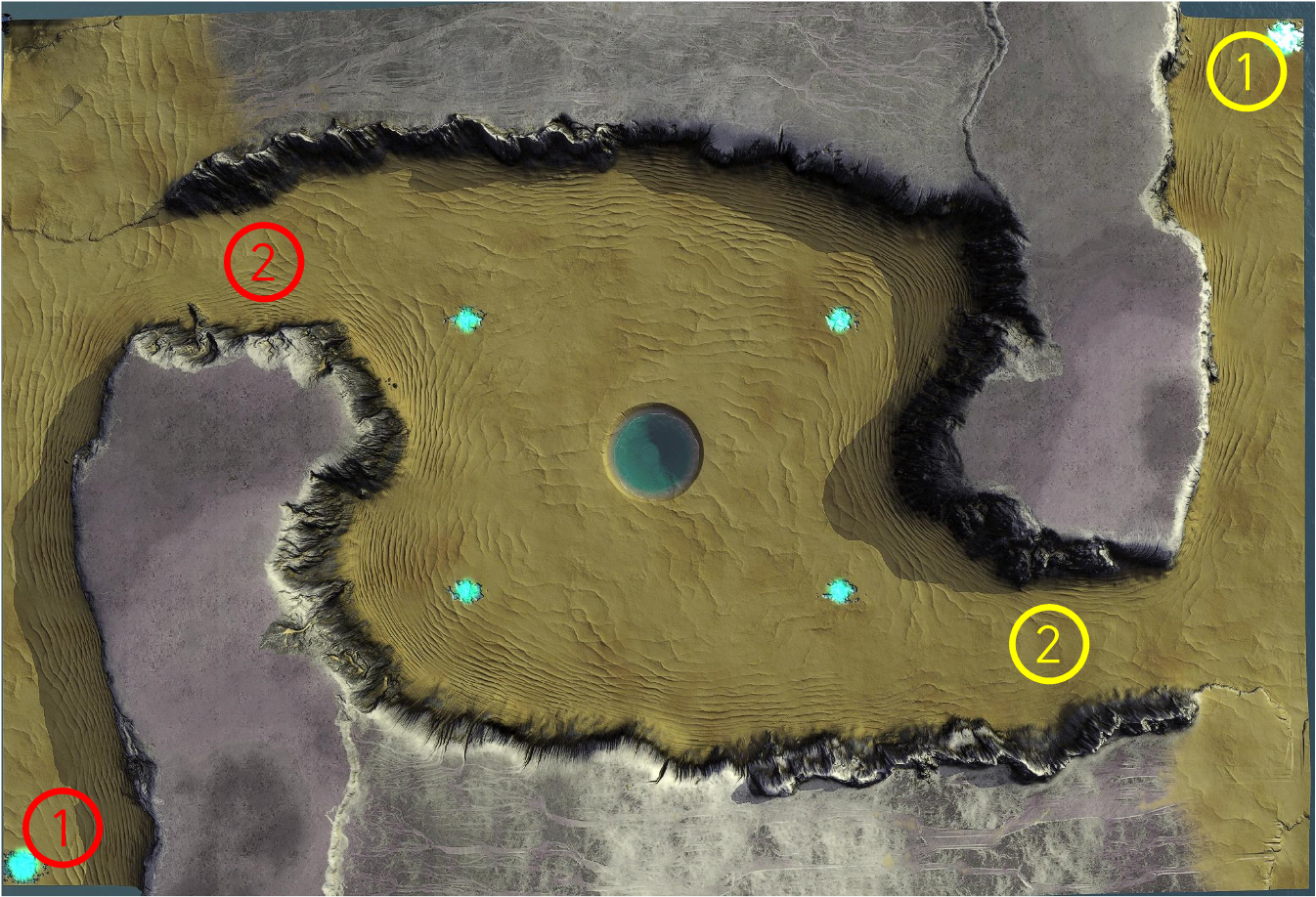 | 적이 선점할 경우 입구막기가 되어 말라죽을수 있다. 또한 ⓑ 언덕과 연계되면 매우 큰 타격을 받게 된다. | 적이 선점할 경우 위에서 언급한 2개의 시작지점에 모두 타격이 가능하다. | 조력 발전기를 통한 에너지 및 중앙에 4개의 금속 매장지 확보할수 있다. |