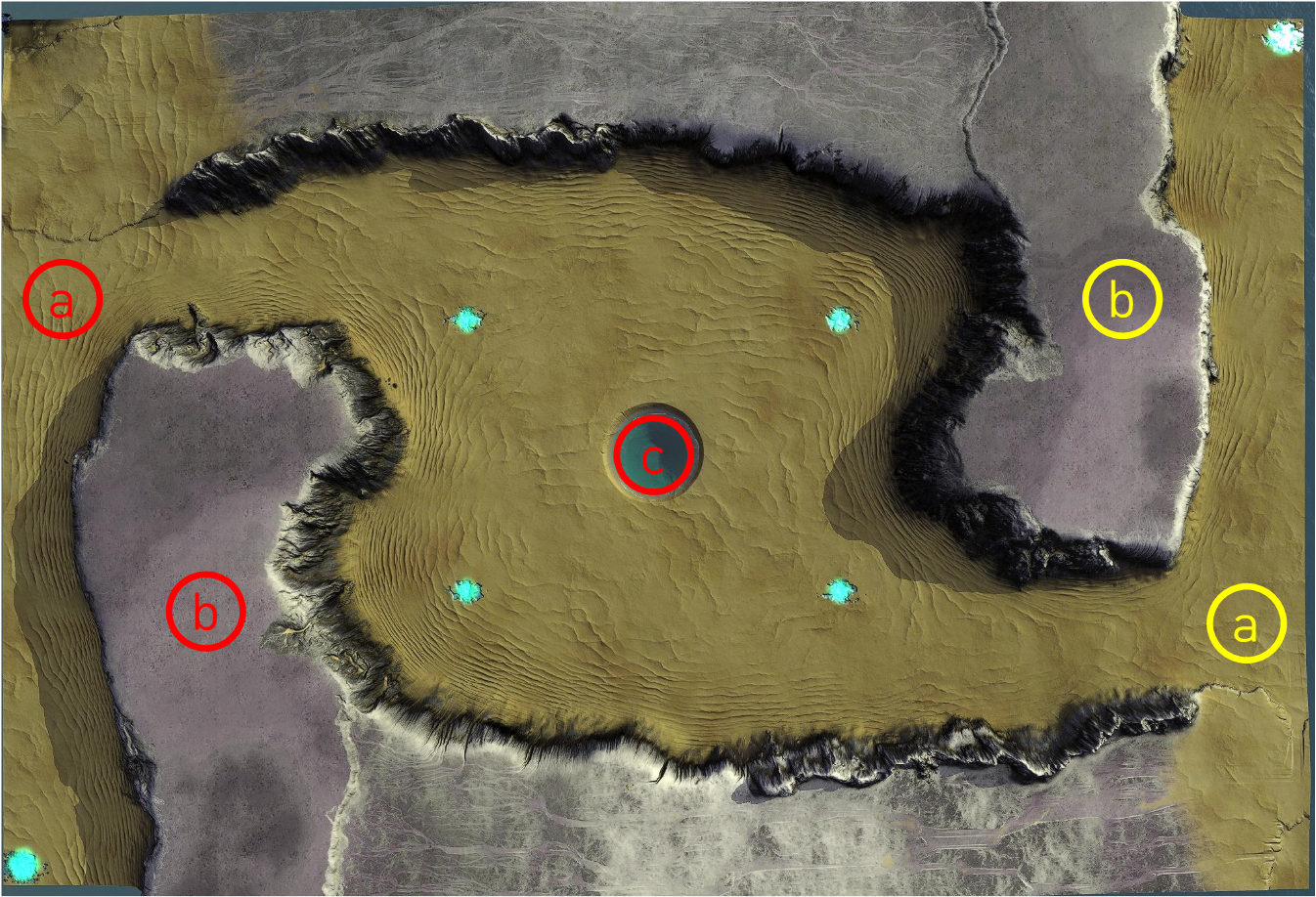 이 지도의 중요 지역(Important Area)은 ⓐ 입구 삼거리, ⓑ 언덕, ⓒ 중앙 바다 3곳이 있다.