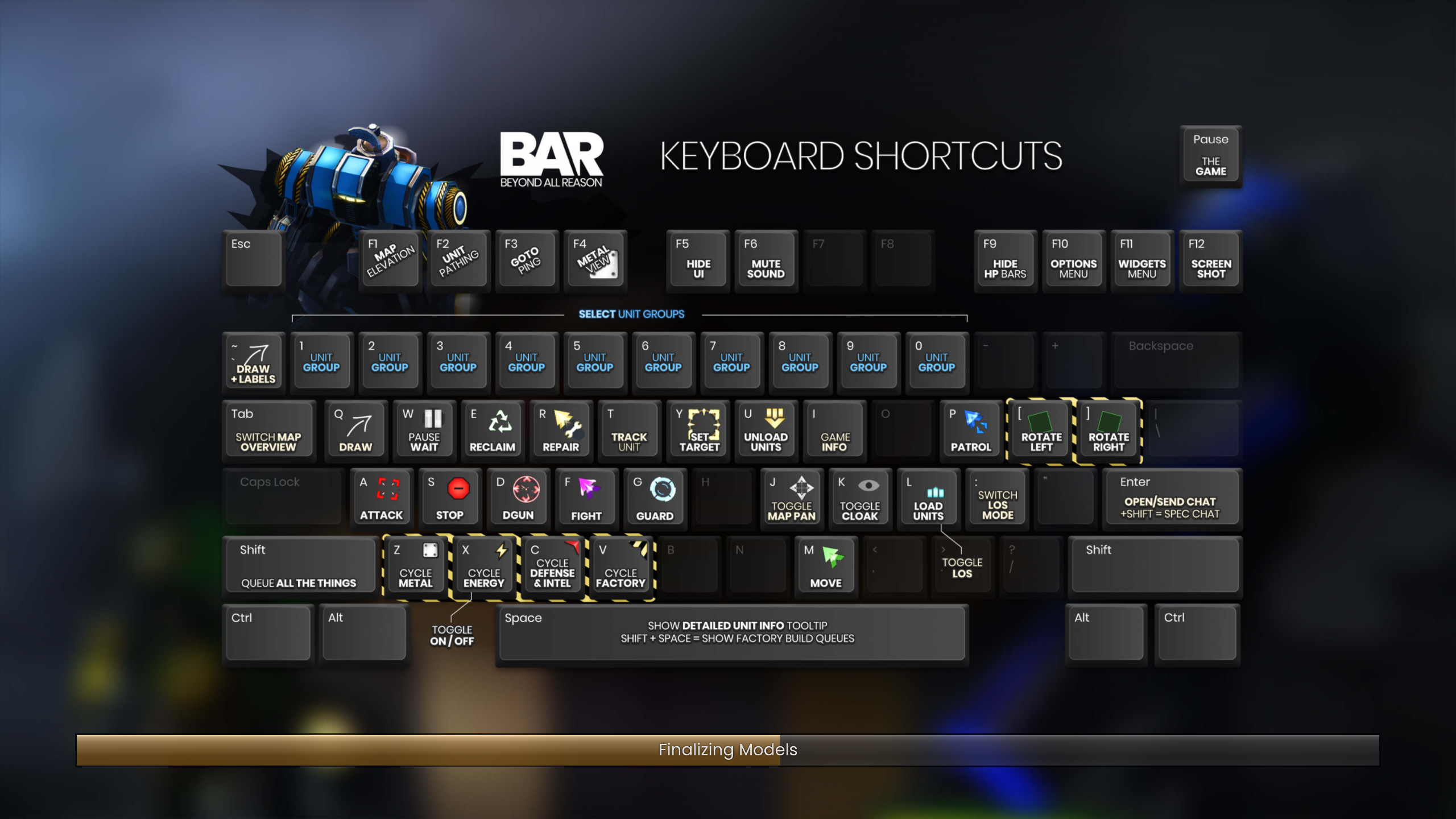 버그가 있거나, 좋은 아이디어, 어떤 방식으로든 기여하고 싶다면 디스코드의 BAR에 가입바란다. - Use ALT+(0-9) to assign selected unit type(s) to autogroups. Newly built units of the same type(s) will get automatically added to their autogroup. ALT+Backquote(`) removes units.