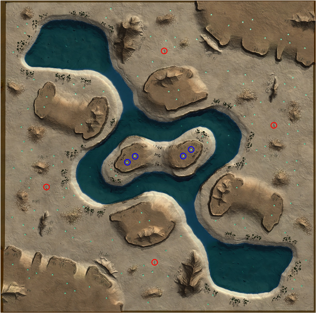오늘은 Erebos Lakes v1.0에 대해 알아보았다. 각 팀의 시작지점은 주로 평지로 형성되어 있으나, 접족하는 지역인근에는 언덕, 물, 협곡 등의 고저차가 발생하게 전선이 형성되는 특이한 지도 이다. 차량, 봇, 항공기, 해전까지 모든 종류의 전투가 가능하고, 모든 유형의 유닛을 활용가능한 매우 재미있는 맵이다. 거의 평지 맵과 비슷하여, ①, ⑤, ⑥, ⑦, ⑧플레이어는 신속하게 전선을 형성하여 적의 침투를 막아야 한다. 또한 생산지역에서 전선까지 병력증원에 많은 시간이 소모되므로 바르게 전진 생산기지를 구축하는것도 매우 좋은 방법이다.