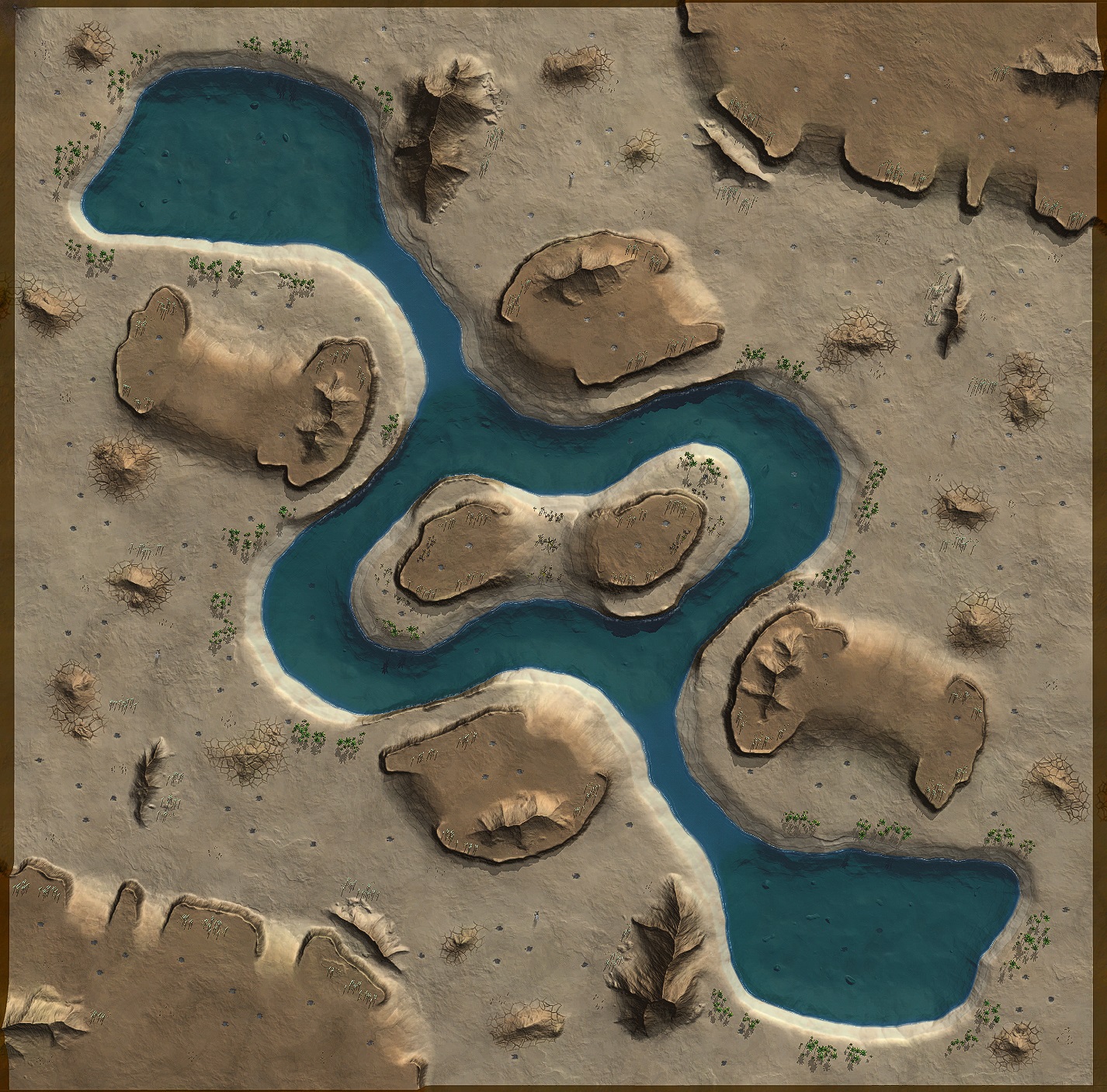 이 지도의 중요 지역(Important Area)은 ⓐ(중앙 섬), ⓑ(수로), ⓒ(넓은 언덕), ⓓ(좁은 언덕), ⓔ(호수), ⓕ(중앙 해안선)으로 생각한다. 언덕과 산이 많지만 주요 지역을 중심으로 표시하였다.