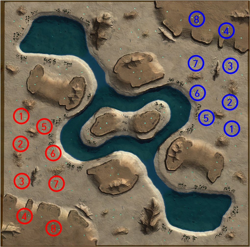 이 지도는 일반적으로 8v8 팀전을 많이 하는 지도 이다. 팀별 8개소의 시작 지점(Start Point)를 표시하였다.