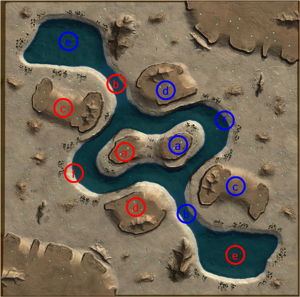 ⓐ(중앙 섬)은 3.4 금속 매장지 4개가 있고, 원형 물 지형으로 요새화 시킬수 있다. ⓕ로 진출이 용이하여, 적의 기지로 바로 공격이 가능하고, 또한 다른 거의 대다수 중요지역으로 바로 접근이 간능한 매우 중요한 지역이다. 시작지점 ⑥에서 주로 이곳을 점령하려 한다.